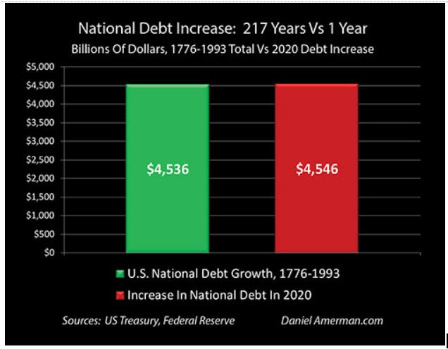 To help gain some perspective on just how historically off the scale the run up in the national debt was in 2020, the green bar on the left in the graph shows the total national debt accumulated by the United States between 1776 and 1993, the first 217 years of the nation. That totaled $4,536 billion, or $4.5 trillion in debt.