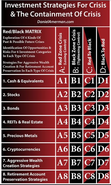 That is not the same thing as gloom and doom thinking. As explored in detail using the Red/Black matrix shown above (link here), in chapters written well before this crisis, record stock prices, record bond prices and record home prices are the logical consequences of the massive monetary creation and lower interest rates that would be the results of the next cycle of the attempted containment of crisis. We studied in this book what the Fed said it would do in advance, then the Fed actually did it, and the expected increases in stock, bond and home prices did then in fact follow, for the reasons explained in advance.